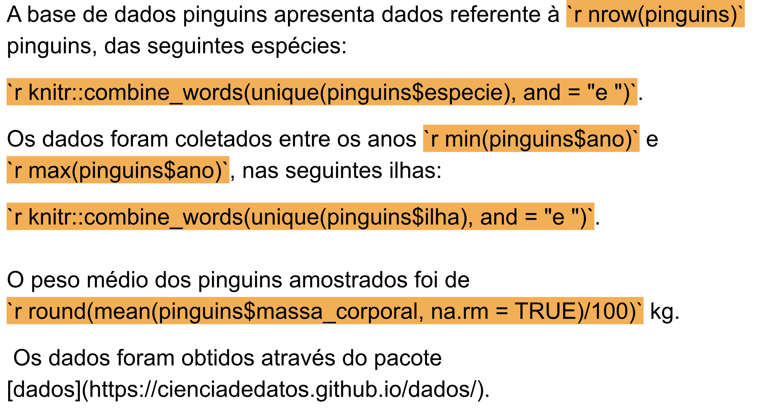 ```A base de dados pinguins apresenta dados referente à 344 pinguins, das seguintes espécies: Pinguim-de-adélia, Pinguim-gentoo, e Pinguim-de-barbicha. Os dados foram coletados entre os anos 2007 e 2009, nas seguintes ilhas: Torgersen, Biscoe, e Dream. O peso médio dos pinguins amostrados foi de 42 kg. Os dados foram obtidos através do pacote dados.
