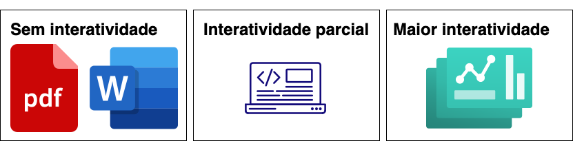 Os elementos adicionados podem ter algum nível de interatividade (como mapas, gráficos, tabelas) utilizando bibliotecas em JavaScript.