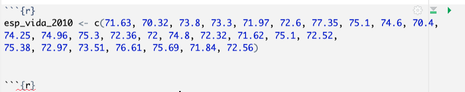 esp_vida_2010 <- c(71.63, 70.32, 73.8, 73.3, 71.97, 72.6, 77.35, 75.1, 74.6, 70.4, 74.25, 74.96, 75.3, 72.36, 72, 74.8, 72.32, 71.62, 75.1, 72.52, 75.38, 72.97, 73.51, 76.61, 75.69, 71.84, 72.56)